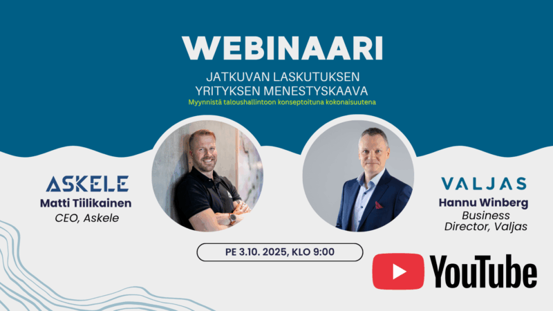 Katso Valjaan ja Askeleen yhteiswebinaarin tallenne ja näe, miten jatkuvan laskutuksen malli rakentuu käytännössä – myynnistä kassavirtaan asti.