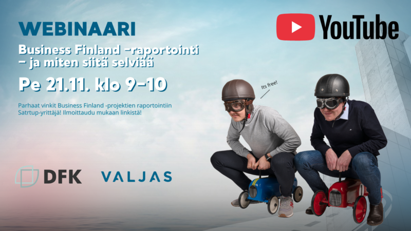Tervetuloa mukaan Valjaan toimitusjohtajan Pasi Tasasen ja DFK:n tilintarkastaja Fredrikin Bäckin vetämään käytännönläheiseen ja rennolla otteella pidettävään sessioon, jossa kirjanpitäjä ja tilintarkastaja jakavat parhaat vinkkinsä Business Finland -projektien raportointiin ja kehityskulujen dokumentointiin. Chatissä voit kysyä askarruttavat kysymyksesi. Webinaari tallennetaan, joten saat nauhoitteen perästä, jos et ehdi mukaan.